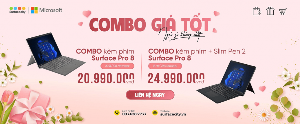 Khi mua Surface Pro 8 tại SURFACECITY, bạn sẽ được nhận ngay những khuyến mãi cực hấp dẫn: giảm đến 15% giá phụ kiện, tặng bộ quà tặng chính hãng Microsoft trị giá 2.5 triệu,….cùng chế độ bảo hành 1 đổi 1 đến 12 tháng. Liên hệ ngay với chúng tôi để được tư vấn thêm.