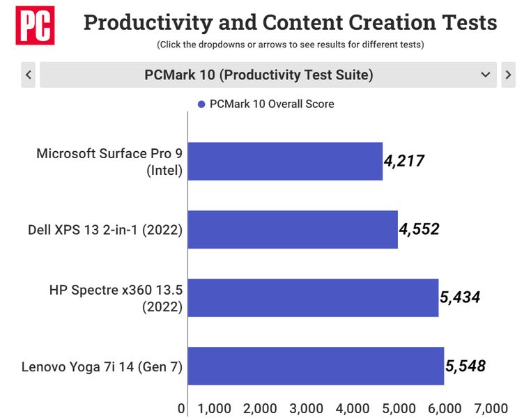 Thử nghiệm đầu tiên trên chiếc Surface Pro 9 là kiểm tra năng suất và sáng tạo nội dung thông qua bài kiểm tra PCMark 10 của UL, thử nghiệm này mô phỏng nhiều quy trình làm việc văn phòng và năng suất trong thế giới thực để đo hiệu suất tổng thể của Pro 9.
