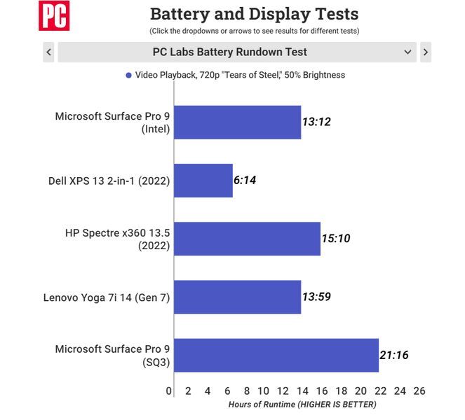 Kết quả cho thấy thời lượng pin của Surface Pro 9 Core i7 với thời lượng pin 13 giờ đầy ấn tượng. Con số này đã phá tan kỷ lục cao nhất trên phiên bản tiền nhiệm và khiến XPS của Dell tiếp tục bị đánh bại bởi thời lượng pin ấn tượng trên pro 9.